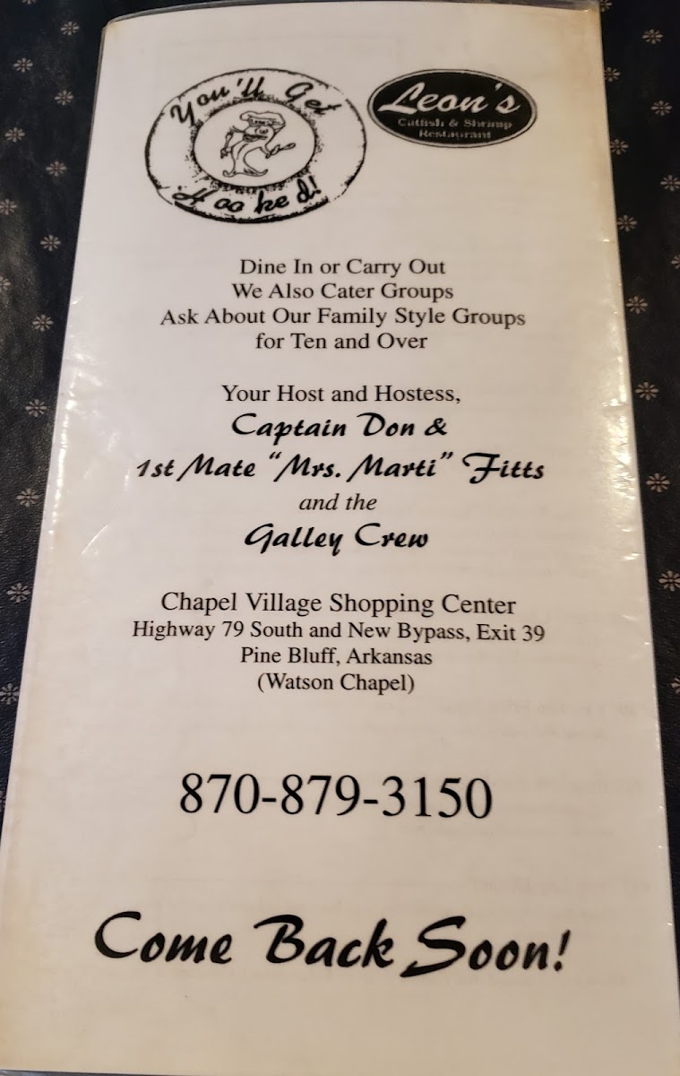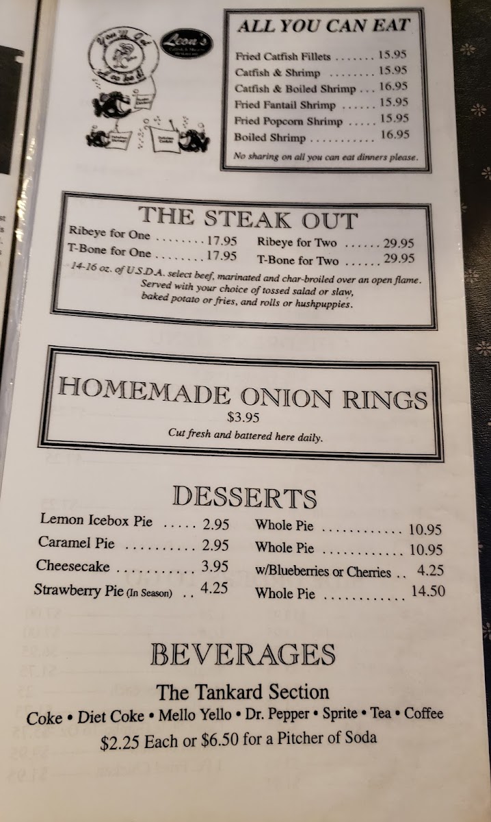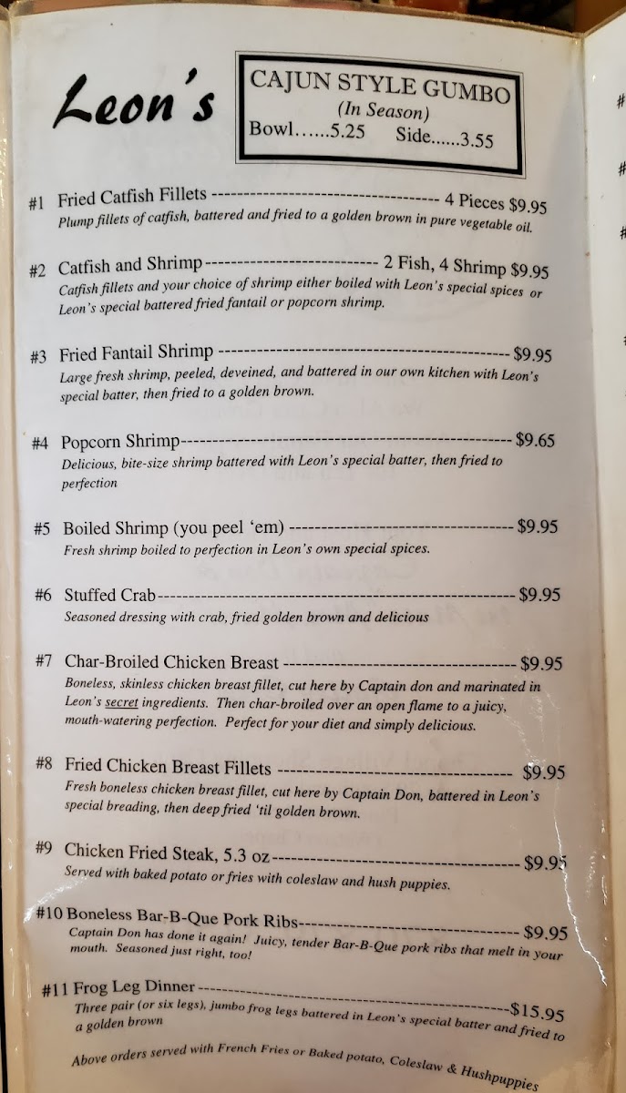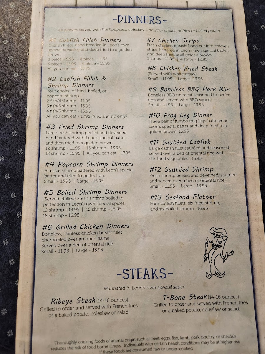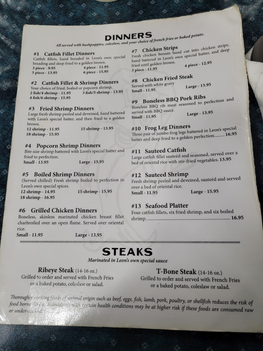 Leon's Catfish & Shrimp Restaurant offers a straightforward, comforting menu rooted in traditional American and Southern seafood fare. The selection features familiar, hearty dishes like fried catfish, shrimp plates, and ribeye steak meals, all designed for relaxed, satisfying dining. Whether you're stopping by for a casual lunch or a laid-back dinner, the menu invites you to enjoy classic flavors in a welcoming, unpretentious setting.